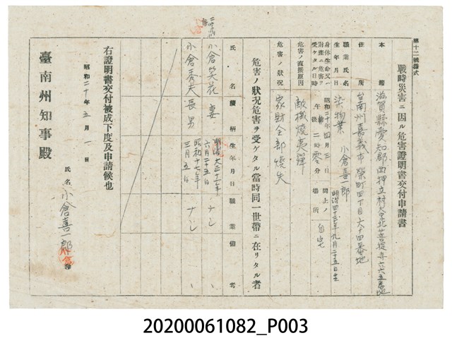 1945年5月1日小倉喜一郎家族之戰時造成的意外災害證明書與交付申請書
