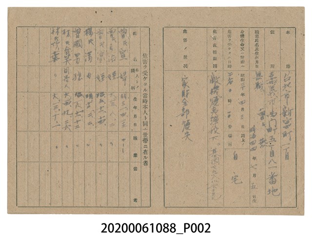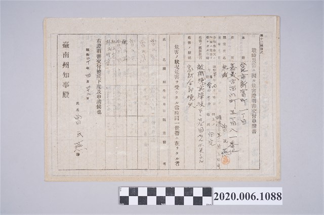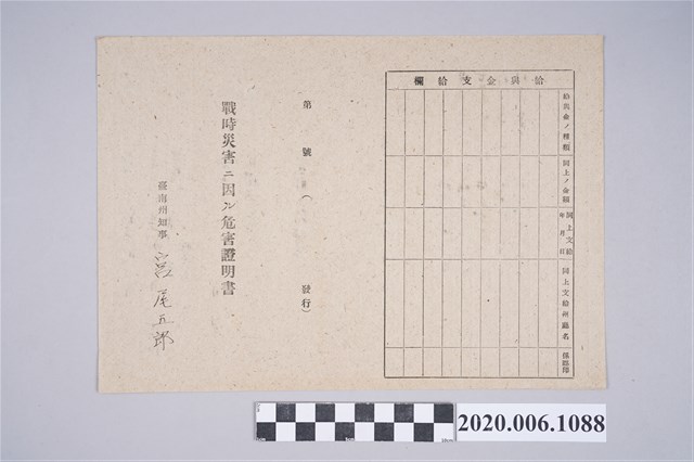 2020.006.1088 1945年4月28日曾氏燕家族之戰時造成的意外災害證明書與交付申請書