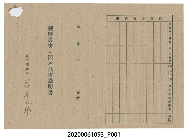 本件長19公分、寬26公分、高0.1公分。為戰時造成之意外災害證明書,為昭和20年(1945)5月1日發行,經手人為臺南州知事宮尾五郎,後方附上文件為個案證明書,包含受害者之籍貫、住所、危害狀況、給付金等相關資料。
