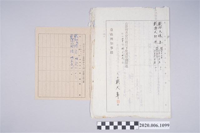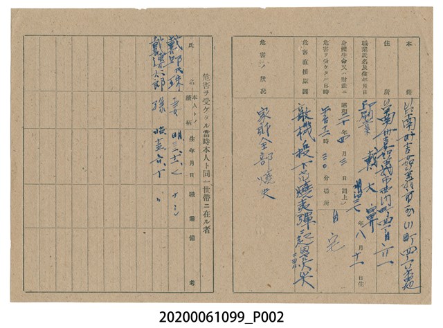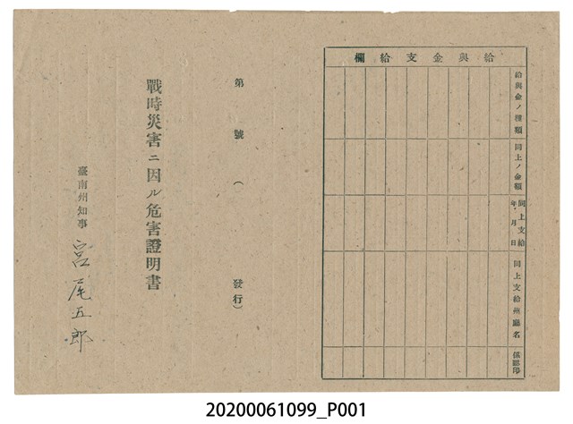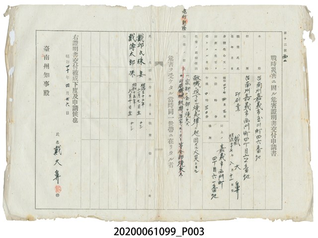 2020.006.1099 1945年4月26日戴大鼻家族之戰時造成的意外災害證明書與交付申請書