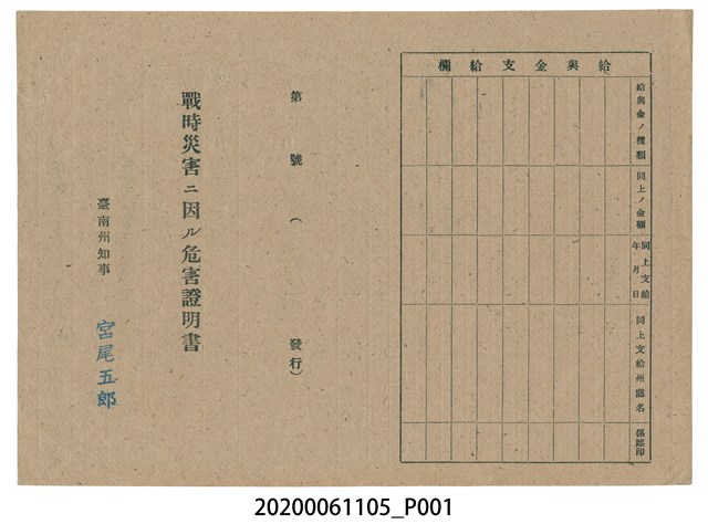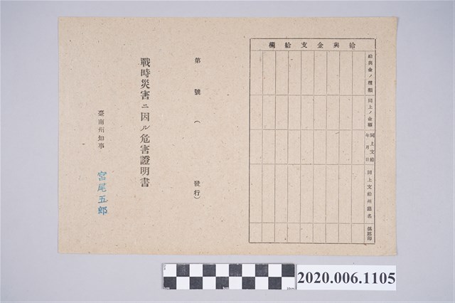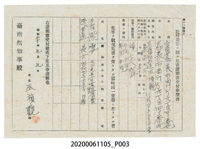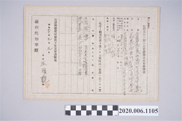 2020.006.1105 1945年9月9日巫禎觀家族之戰時造成的意外災害證明書與交付申請書