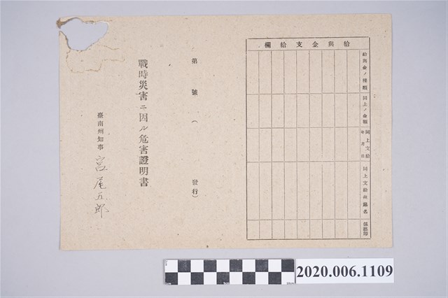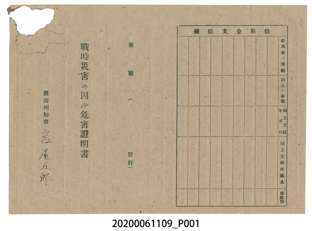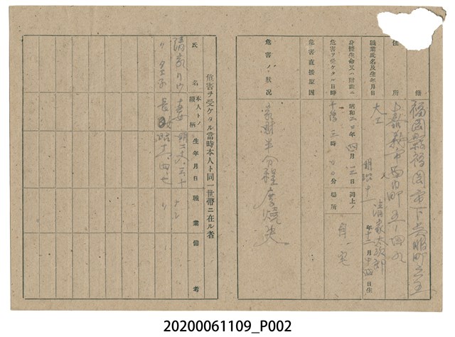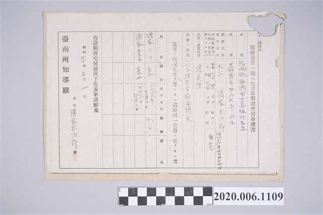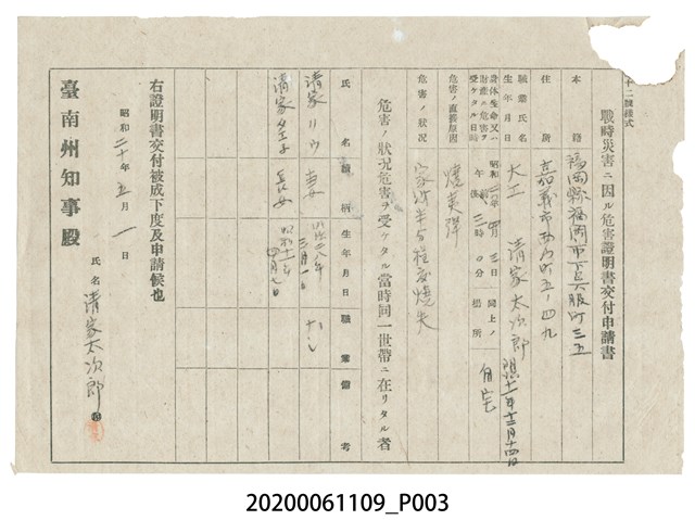 2020.006.1109 1945年5月1日清家太次郎家族之戰時造成的意外災害證明書與交付申請書