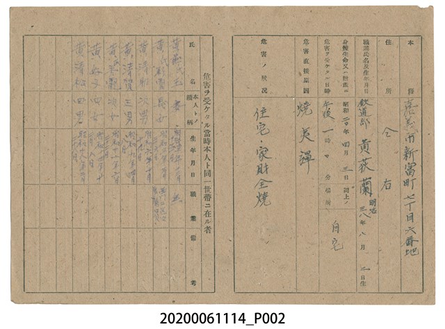2020.006.1114 1945年4月28日黄荻蘭家族之戰時造成的意外災害證明書與交付申請書