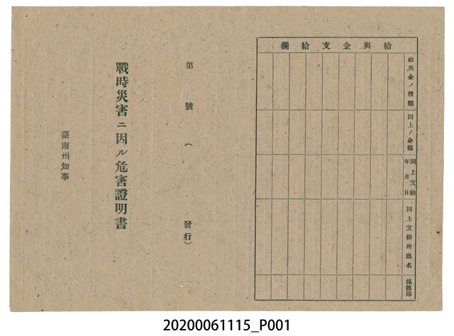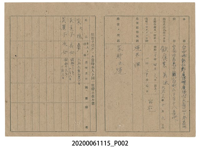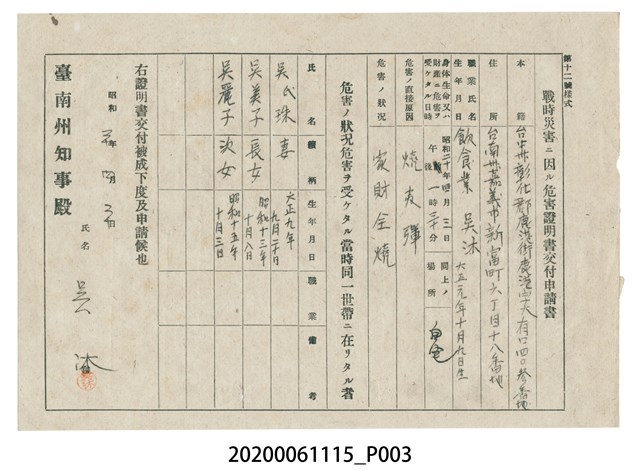 2020.006.1115 1945年4月20日吳沐家族之戰時造成的意外災害證明書與交付申請書