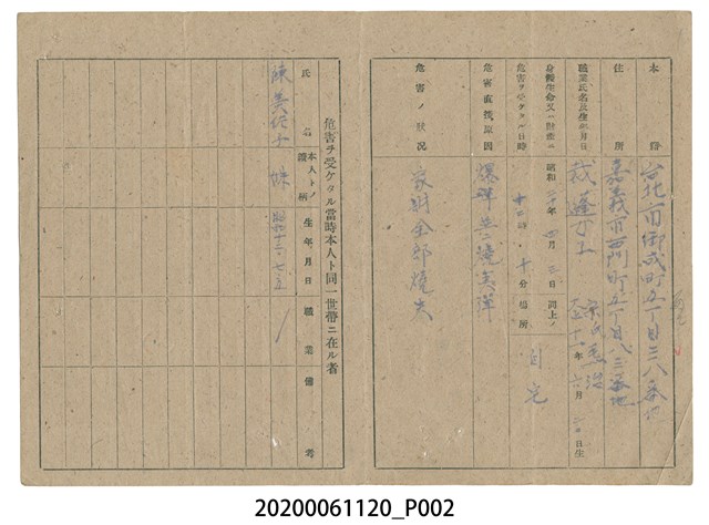 本件長19公分、寬26公分、高0.1公分。為戰時造成之意外災害證明書,為昭和20年(1945)5月30日發行,經手人為臺南州知事宮尾五郎,後方附上文件為個案證明書,包含受害者之籍貫、住所、危害狀況、給付金等相關資料。