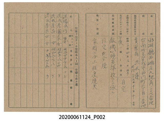 本件長19公分、寬26公分、高0.1公分。為戰時造成之意外災害證明書,為昭和20年(1945)6月10日發行,經手人為臺南州知事宮尾五郎,後方附上文件為個案證明書,包含受害者之籍貫、住所、危害狀況、給付金等相關資料。