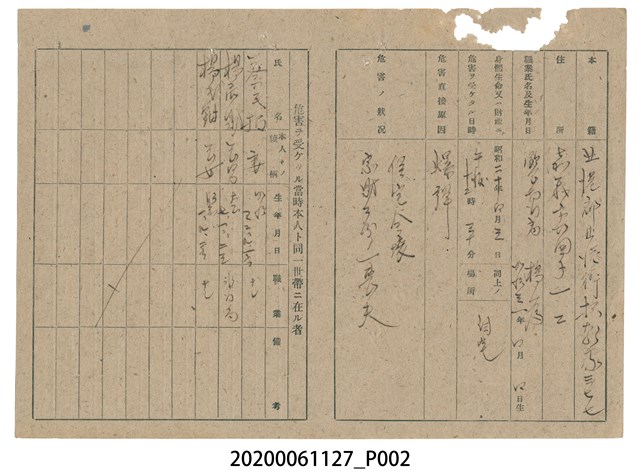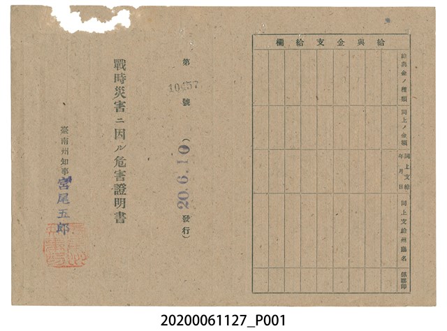 戰時造成的意外災害證明書第10457號(昭和20年6月10日發行)