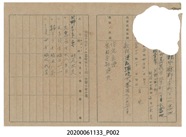 戰時造成的意外災害證明書第10463號(昭和20年6月10日發行)