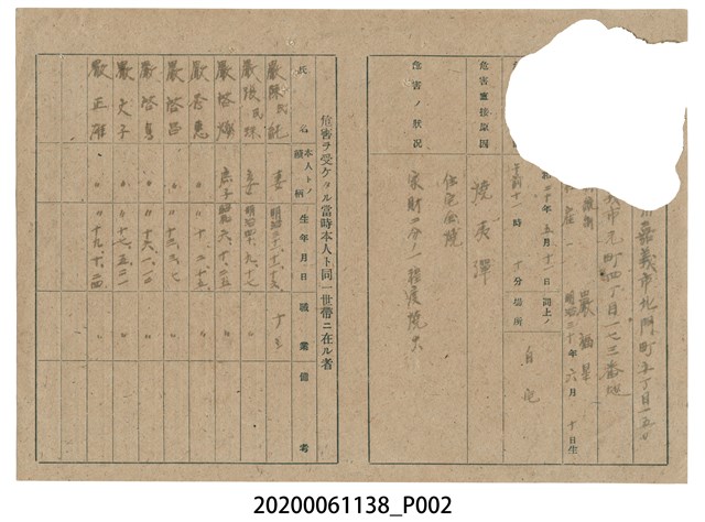本件長19公分、寬26公分、高0.1公分。為戰時造成之意外災害證明書,為昭和20年(1945)6月10日發行,經手人為臺南州知事宮尾五郎,後方附上文件為個案證明書,包含受害者之籍貫、住所、危害狀況、給付金等相關資料。