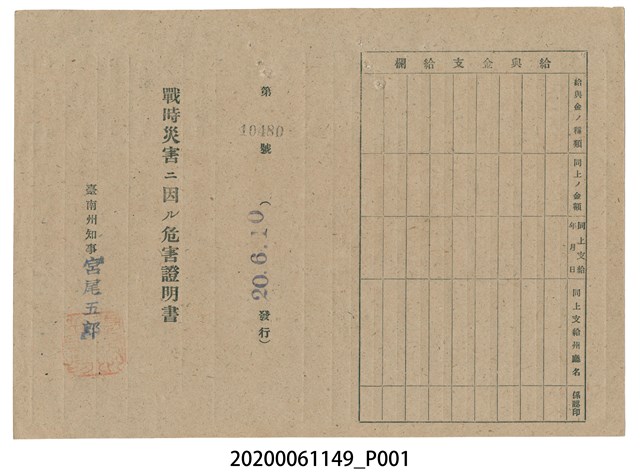 2020.006.1149 戰時造成的意外災害證明書第10480號(昭和20年6月10日發行)