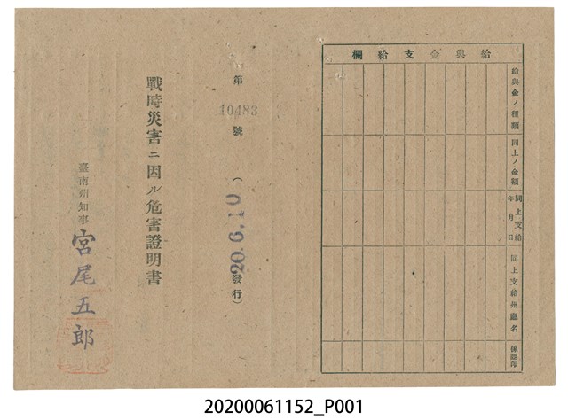 2020.006.1152 戰時造成的意外災害證明書第10483號(昭和20年6月10日發行)