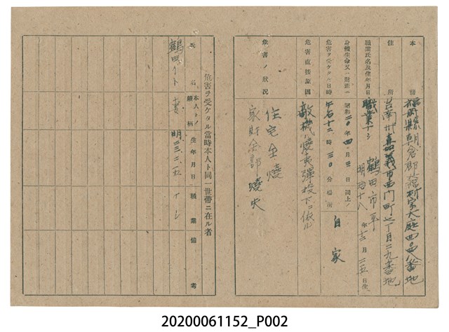 戰時造成的意外災害證明書第10483號(昭和20年6月10日發行)