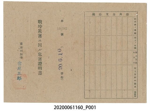2020.006.1160 戰時造成的意外災害證明書第10492號(昭和20年6月10日發行)