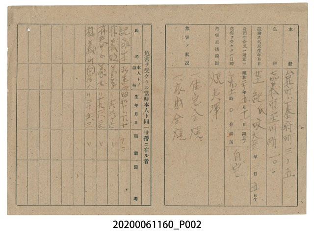 戰時造成的意外災害證明書第10492號(昭和20年6月10日發行)