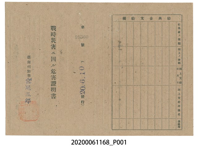 2020.006.1168 戰時造成的意外災害證明書第10500號(昭和20年6月10日發行)