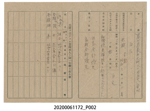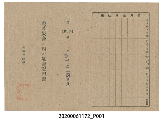 2020.006.1172 戰時造成的意外災害證明書第10504號(昭和20年6月10日發行)