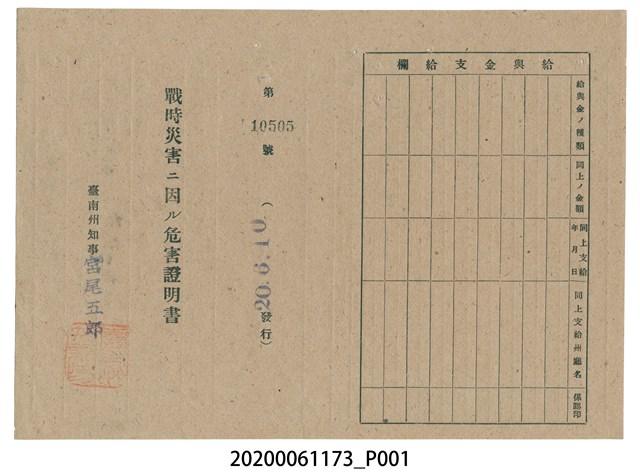 2020.006.1173 戰時造成的意外災害證明書第10505號(昭和20年6月10日發行)