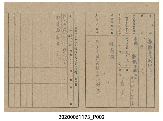 戰時造成的意外災害證明書第10505號(昭和20年6月10日發行)