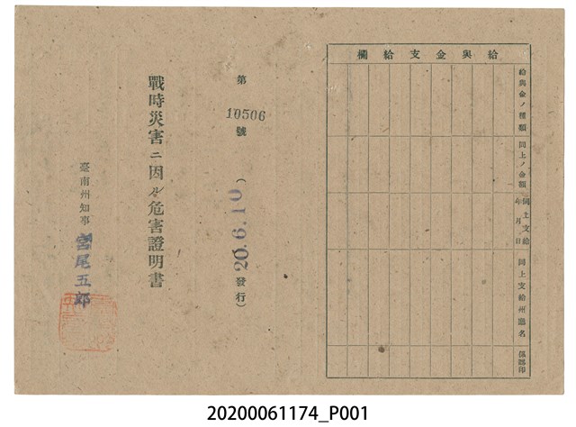 2020.006.1174 戰時造成的意外災害證明書第10506號(昭和20年6月10日發行)
