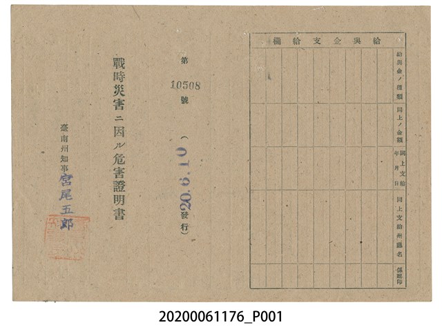 2020.006.1176 戰時造成的意外災害證明書第10508號(昭和20年6月10日發行)
