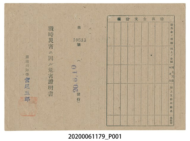 2020.006.1179 戰時造成的意外災害證明書第10513號(昭和20年6月10日發行)