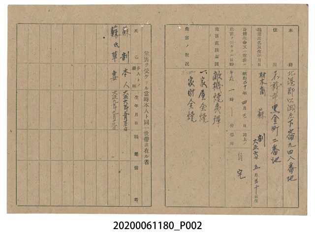 本件長19公分、寬26公分、高0.1公分。為戰時造成之意外災害證明書,為昭和20年(1945)6月10日發行,經手人為臺南州知事宮尾五郎,後方附上文件為個案證明書,包含受害者之籍貫、住所、危害狀況、給付金等相關資料。