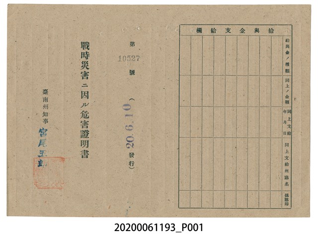 2020.006.1193 戰時造成的意外災害證明書第10527號(昭和20年6月10日發行)