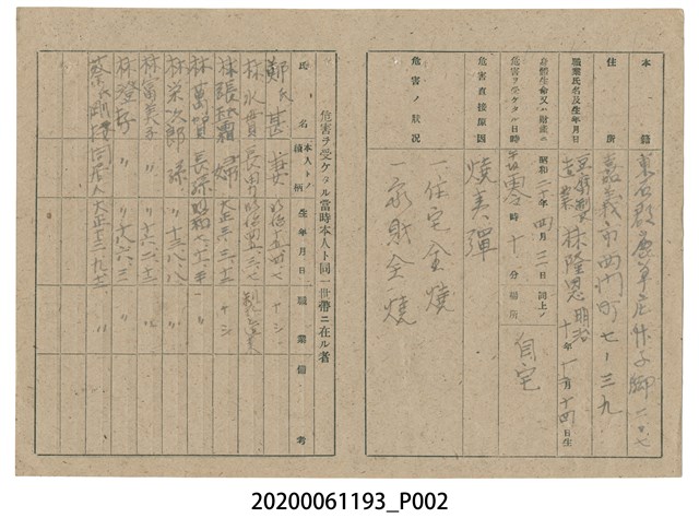 戰時造成的意外災害證明書第10527號(昭和20年6月10日發行)