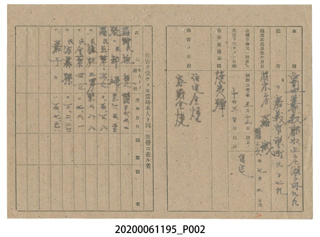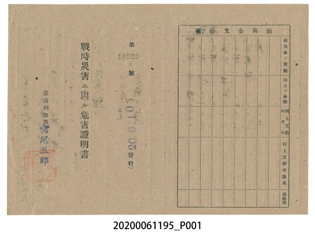 2020.006.1195 戰時造成的意外災害證明書第10529號(昭和20年6月10日發行)