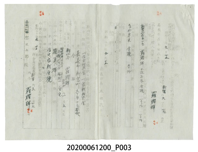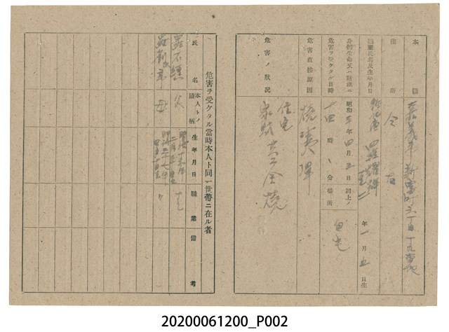 本件長19公分、寬26公分、高0.1公分。為戰時造成之意外災害證明書,為昭和20年(1945)6月10日發行,經手人為臺南州知事宮尾五郎,後方附上文件為個案證明書,包含受害者之籍貫、住所、危害狀況、給付金等相關資料。