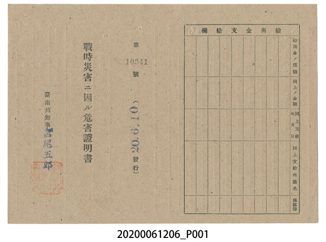2020.006.1206 戰時造成的意外災害證明書第10541號(昭和20年6月10日發行)