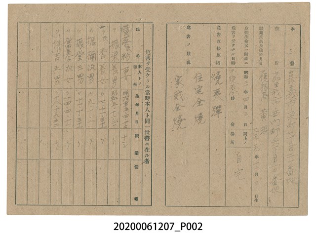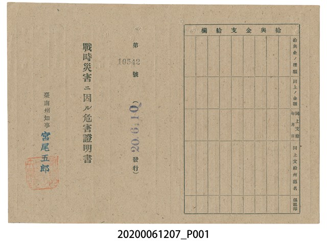 2020.006.1207 戰時造成的意外災害證明書第10542號(昭和20年6月10日發行)