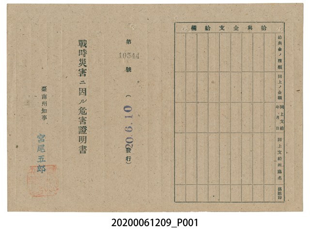 2020.006.1209 戰時造成的意外災害證明書第10544號(昭和20年6月10日發行)