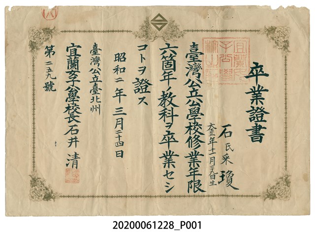 1.本件為石彩瓊就讀臺灣公立臺北州宜蘭女子公學校的畢業證書,石彩瓊於1913(大正2)年11月29日出生,於1927年3月24日取得由宜蘭女子公學校石井清所頒發的畢業證書。證書上蓋有學校大印與校長小章。畢業證書第259號。畢業證書上方與四個邊腳印有「台」字徽。 2.宜蘭女子公學校創立於1918年,是第一所專招收女學童的公學校,前身為設立於1896年的「宜蘭國語傳習所」,曾更名臺北州宜蘭女子學校、臺北州宜蘭市向陽國民學校,戰後更名為宜蘭縣宜蘭市女子國民學校,1996年起開始男女兼收,並改名為「宜蘭縣宜蘭市宜蘭國民小學」至今。