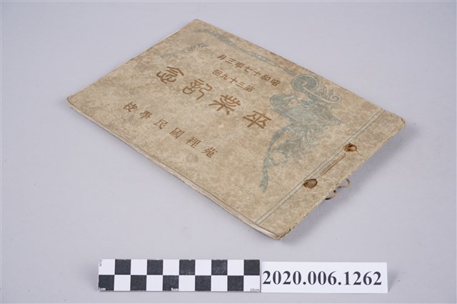 1.苑裡國民學校第三十九屆畢業紀念冊。採橫式印刷,硬殼線裝。封面以灰色為底,右上部有書本、羅盤、葉子、甲蟲等圖象,左半部由上而下依序書寫「昭和十七年三月」、「第三十九回」、「卒業記念」、「苑裡國民學校」等4排字。內容包括校長、教職員、畢業生及校景等多張照片。