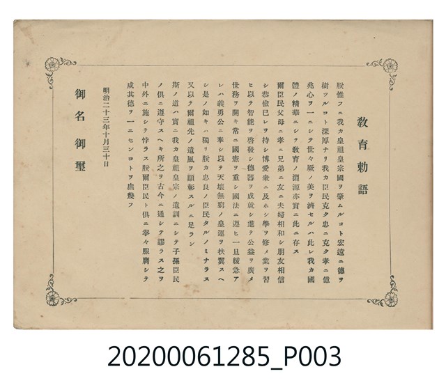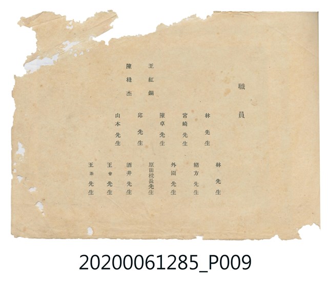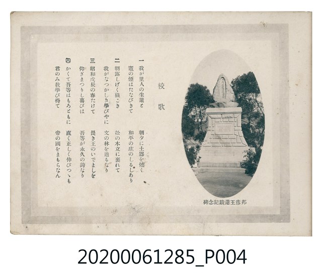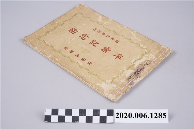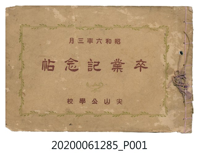 1.本物件是木村寫真館製作《尖山公學校卒業記念帖》。採橫式印刷,線裝。封面以灰色為底,設計幾何圖案方框,框內由上而下依序為「昭和六年三月」、「卒業記念帖」、「尖山公學校」等3排字。內容收錄校門、校長、教職員及學生相關照片,以及各種校園活動照片。最末有版權頁,上載攝影者、印刷資訊。2.尖山公學校前身是1908年創立的三角湧公學校(今三峽國小)尖山分教場,1911年獨立為尖山公學校。1941年更名為鶯歌國民學校,直到日本統治結束。戰後初期延續日治末期校名,1968年因九年義務教育實施,改稱鶯歌國民小學,至今。