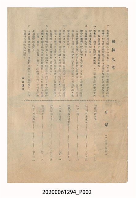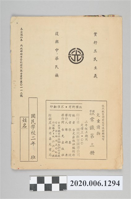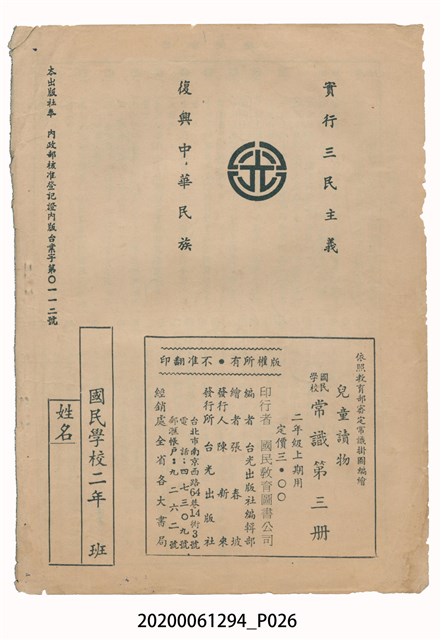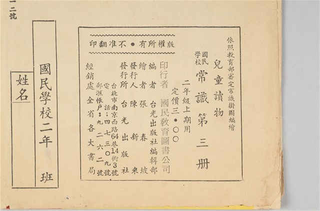 1.本物件為國民小學兒童讀物常識第三冊,為戰後教科書,上面寫有編者台光出版社編輯部及印行者國民教育圖書公司。