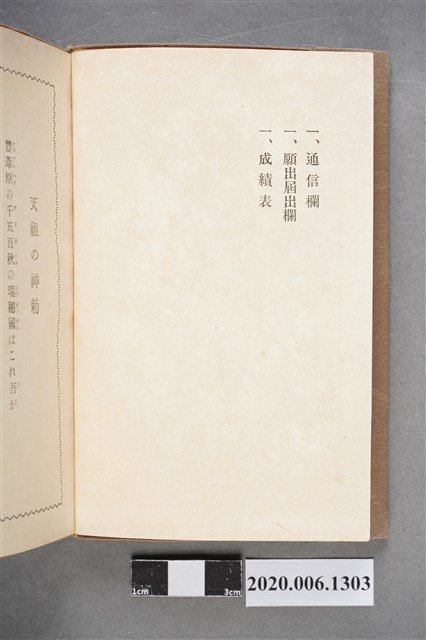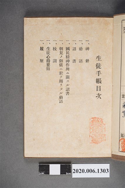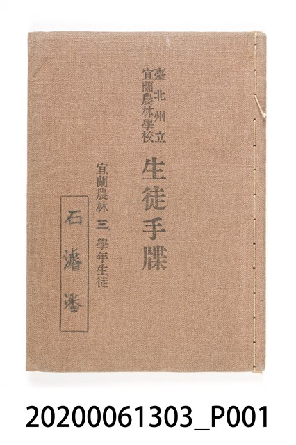 1.本物件是石濬潘就讀宜蘭農林學校的學生手冊。封面中央有「臺北州立宜蘭農林學校生徒手牒」書名,左下部為擁有者姓名及年級。封面內頁上半部為持有者本籍、住所、姓名、出生年月日、出身學校、入學年月日、畢業年月日及印鑑表格,格內手寫資料。下半部為監護人和保證人住所、姓名、職業及印鑑表格,格內手寫資料。手冊內容包括神敕、敕語、詔書、校訓、學生須知及履歷等。