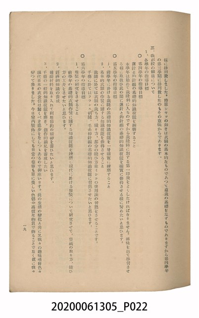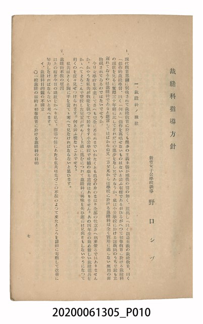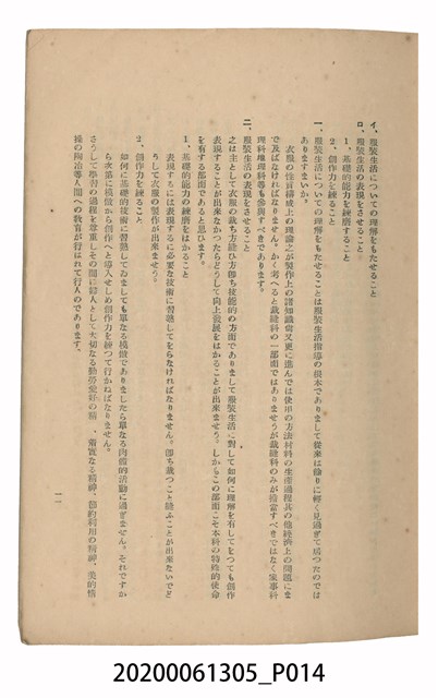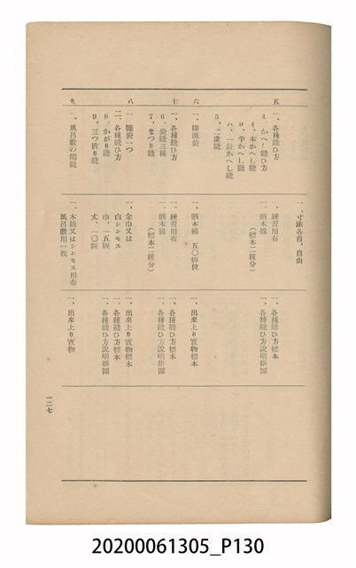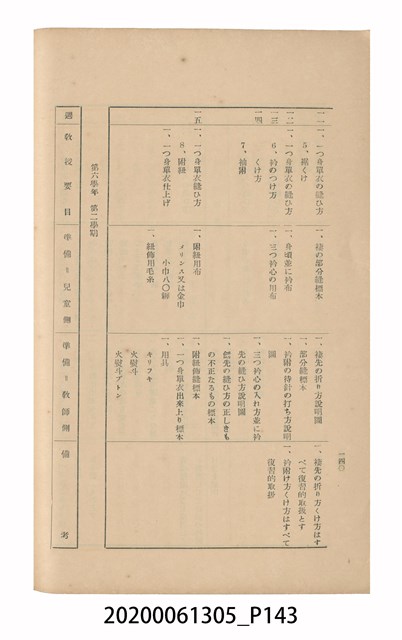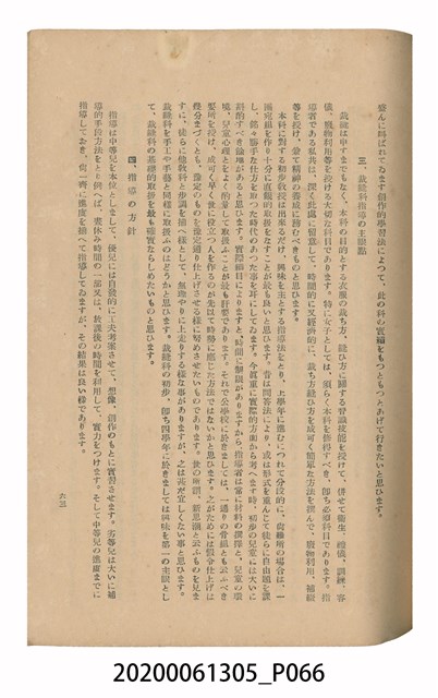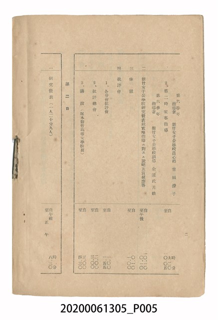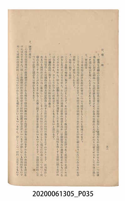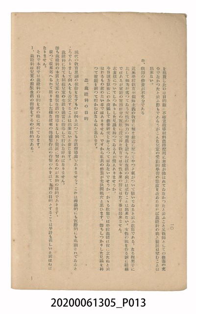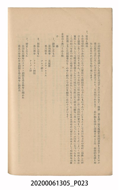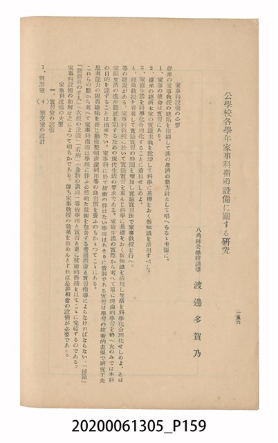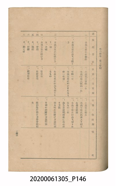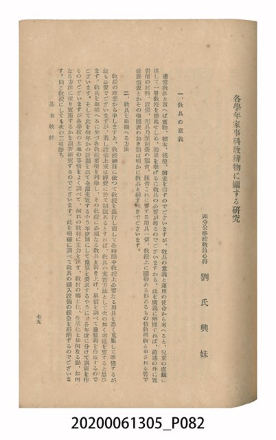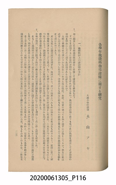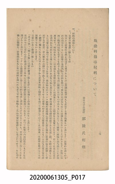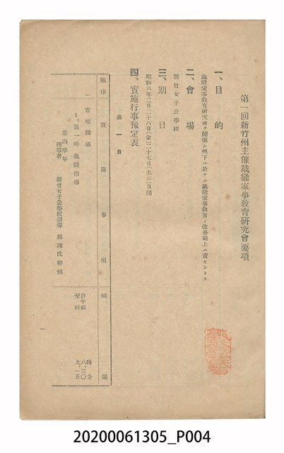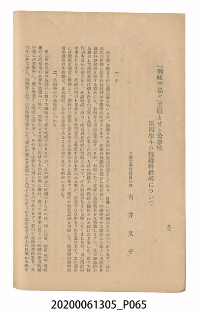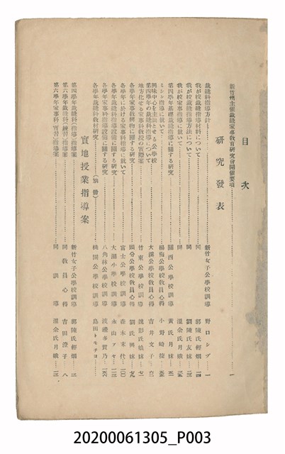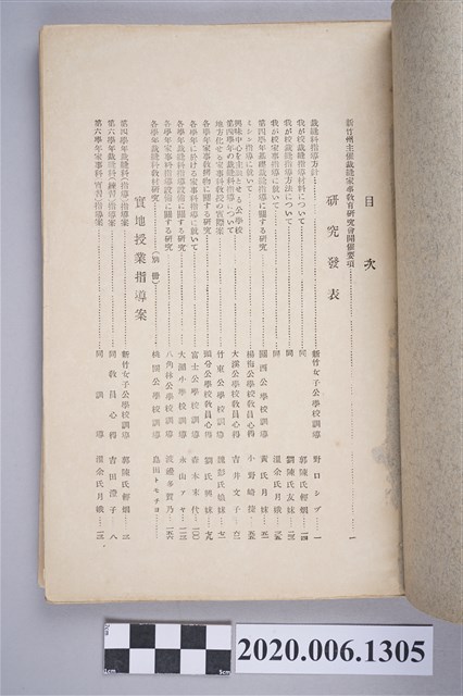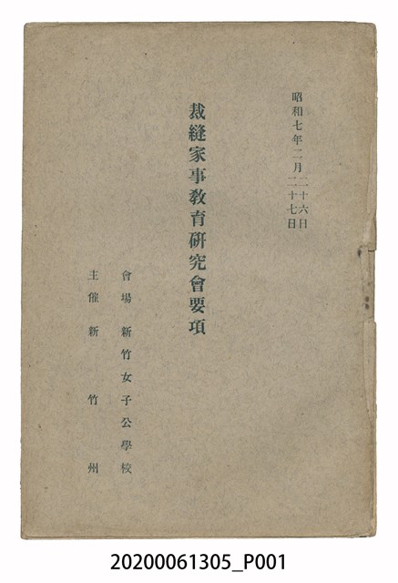 1.本物件是《裁縫家事教育研究會要項》,封面中央印書名,書名右上印「昭和七年二月二十六日二十七日」,左下處印「會場 新竹女子公學校(按:今新竹市民富國小)」、「主催(按:主辦)新竹州」兩行字。本書內容主要是該次研究會的相關資訊。2.臺灣學校的美術教育始於日治時期,在初等教育方面,於1912年11月28日修正的「臺灣公學校規則」,修業年限6年之公學校首度出現「手工及圖畫」教學科目;1921年,「手工及圖畫」科各自獨立為「手工科」和「圖畫科」,圖畫科的教學內容包括臨畫、寫生畫、考察畫等,並可依據各地方情況加課幾何畫。各地方政府不定期會針對圖畫教育舉辦研究會,討論教學相關方法。3.1904年3月11日修正公布的「臺灣公學校規則」,首度將裁縫科列為教學科目,至1912年11月28日修正的「臺灣公學校規則」,則改裁縫科為裁縫及家事科,並成為日治時期初等教育定制。裁縫及家事科只有女子才要修習,實施要旨包括知識技能的習得、助長興趣、婦德的養成等3項。各地方政府不定期會針對該科舉辦研究會,討論教學相關方法。