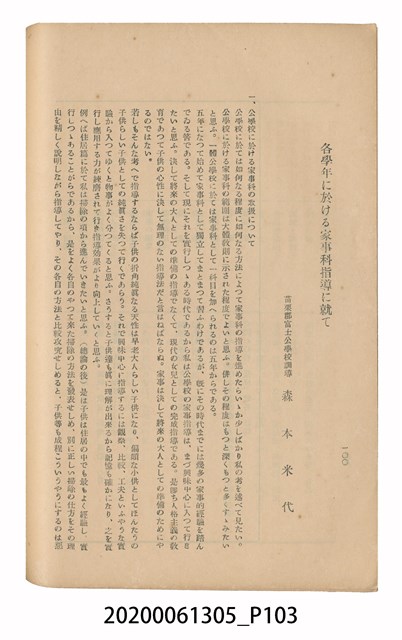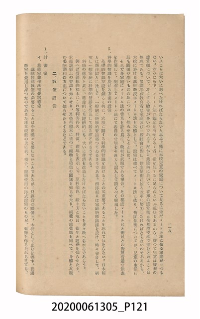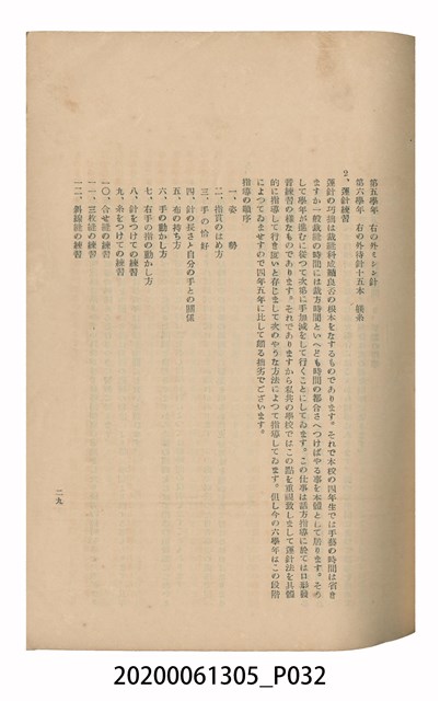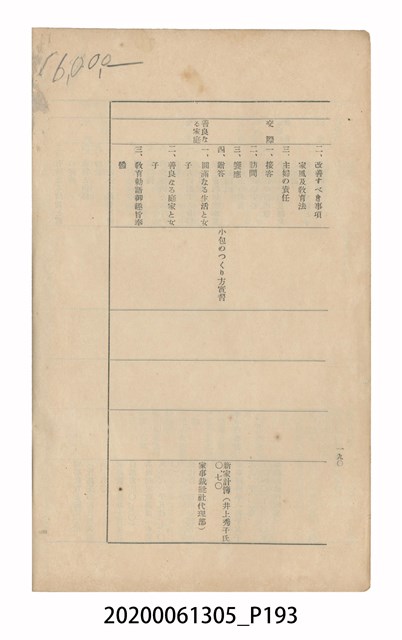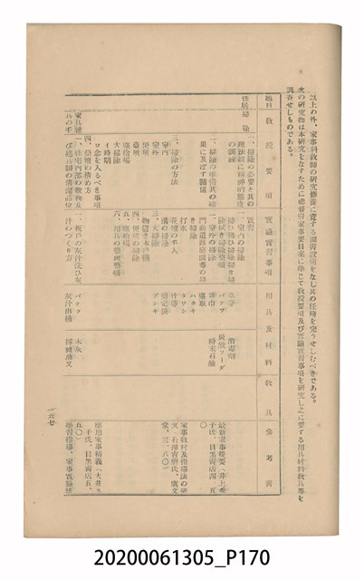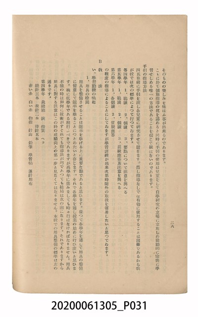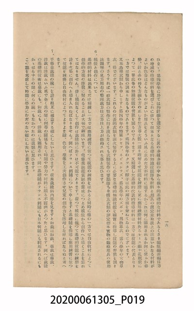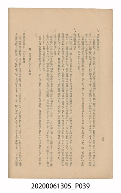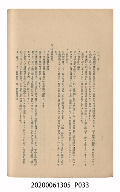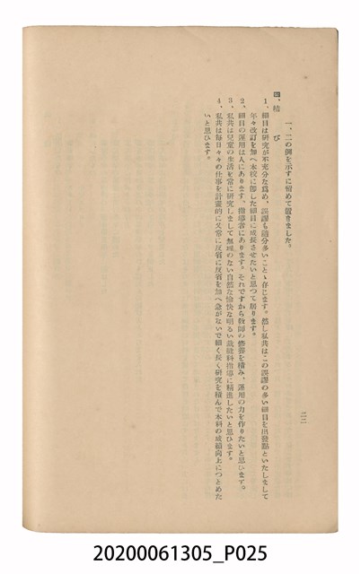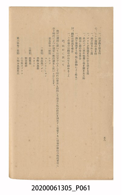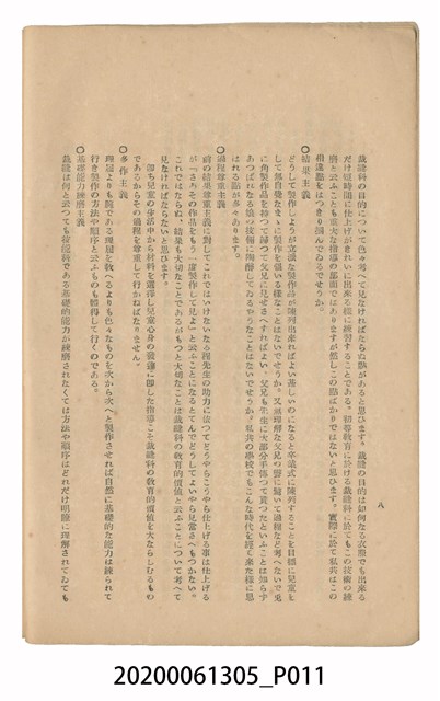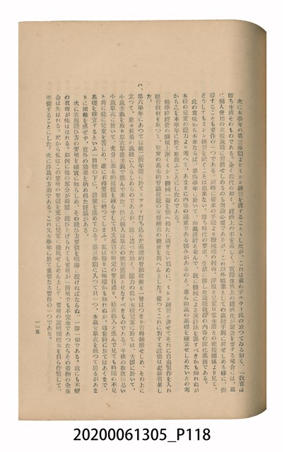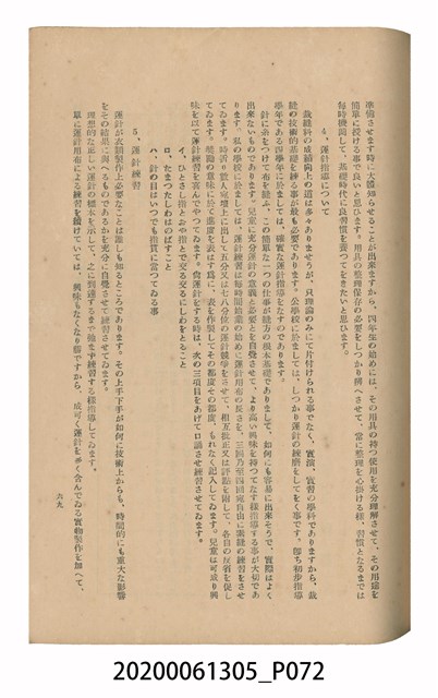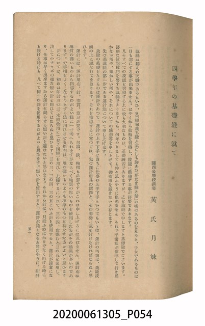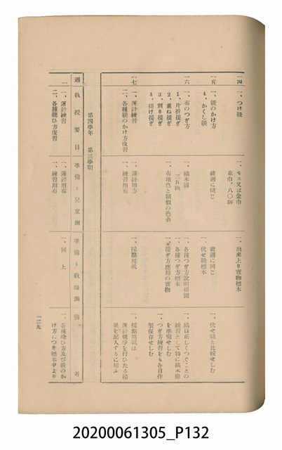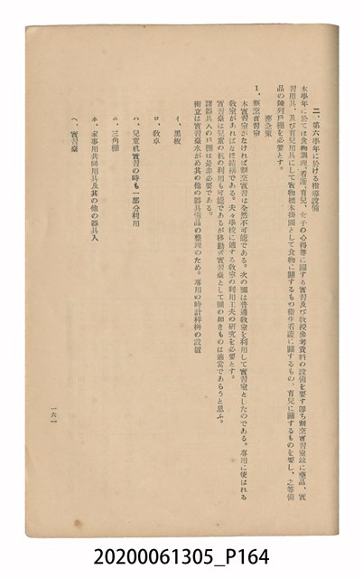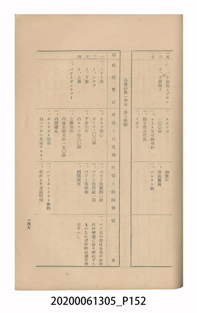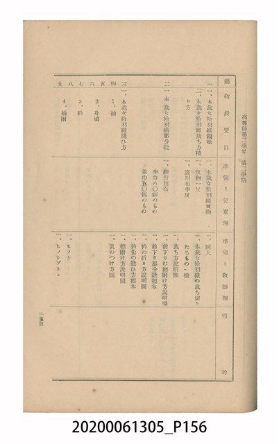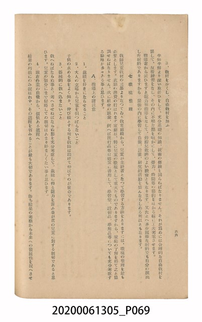1.本物件是《裁縫家事教育研究會要項》,封面中央印書名,書名右上印「昭和七年二月二十六日二十七日」,左下處印「會場 新竹女子公學校(按:今新竹市民富國小)」、「主催(按:主辦)新竹州」兩行字。本書內容主要是該次研究會的相關資訊。2.臺灣學校的美術教育始於日治時期,在初等教育方面,於1912年11月28日修正的「臺灣公學校規則」,修業年限6年之公學校首度出現「手工及圖畫」教學科目;1921年,「手工及圖畫」科各自獨立為「手工科」和「圖畫科」,圖畫科的教學內容包括臨畫、寫生畫、考察畫等,並可依據各地方情況加課幾何畫。各地方政府不定期會針對圖畫教育舉辦研究會,討論教學相關方法。3.1904年3月11日修正公布的「臺灣公學校規則」,首度將裁縫科列為教學科目,至1912年11月28日修正的「臺灣公學校規則」,則改裁縫科為裁縫及家事科,並成為日治時期初等教育定制。裁縫及家事科只有女子才要修習,實施要旨包括知識技能的習得、助長興趣、婦德的養成等3項。各地方政府不定期會針對該科舉辦研究會,討論教學相關方法。