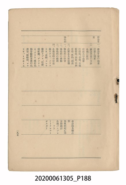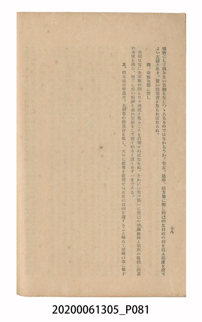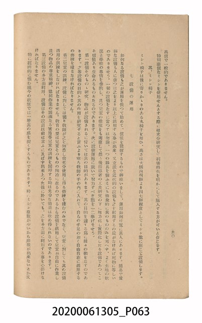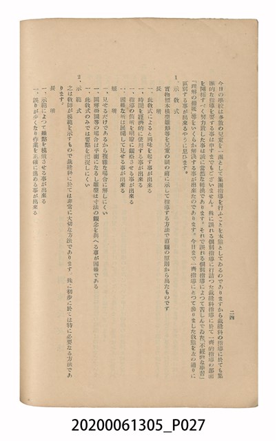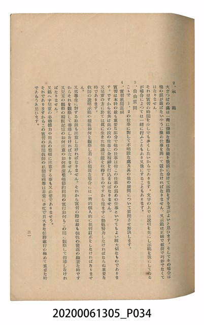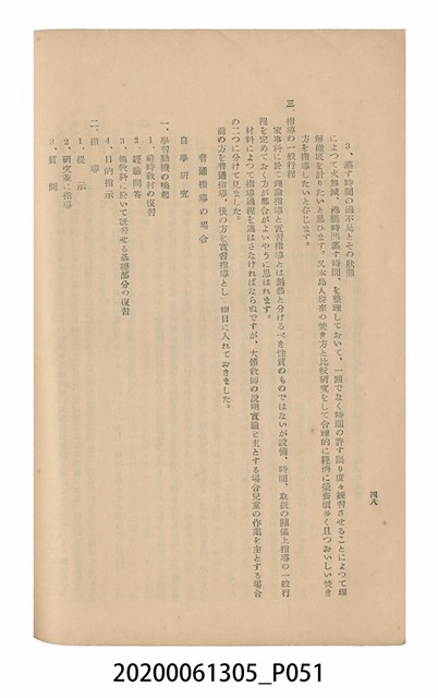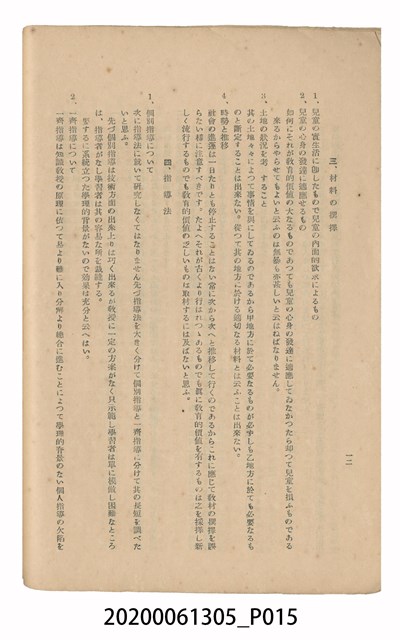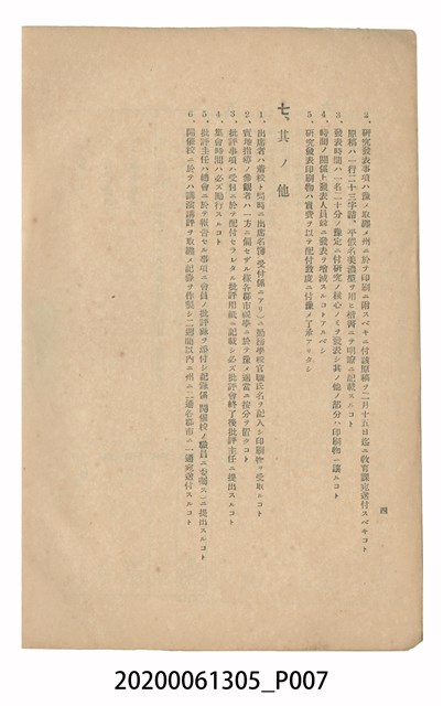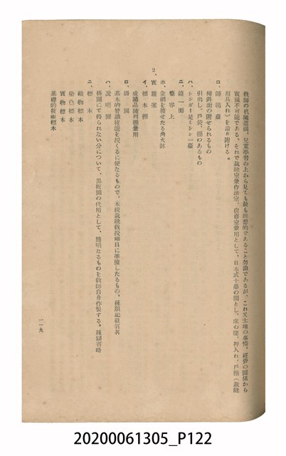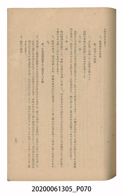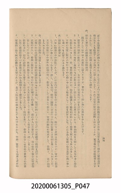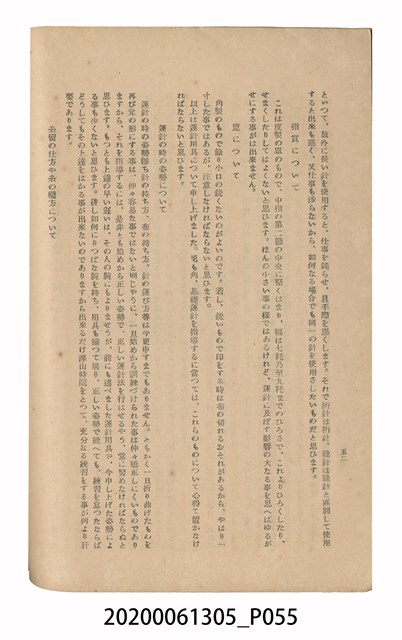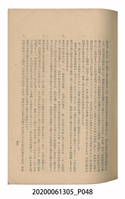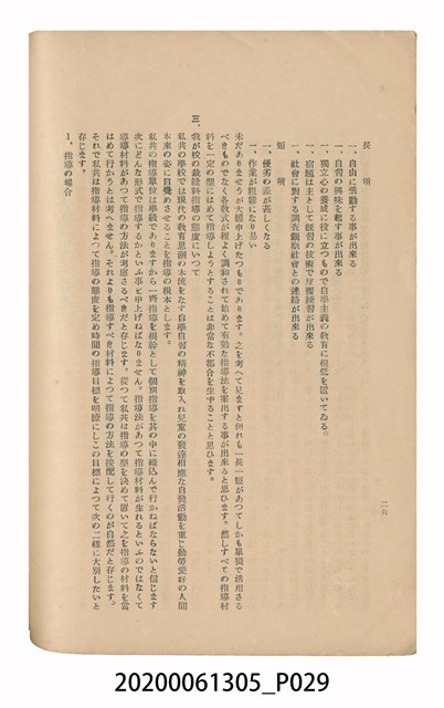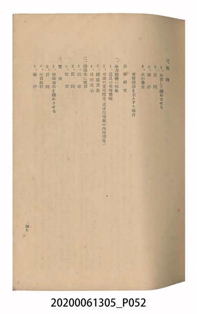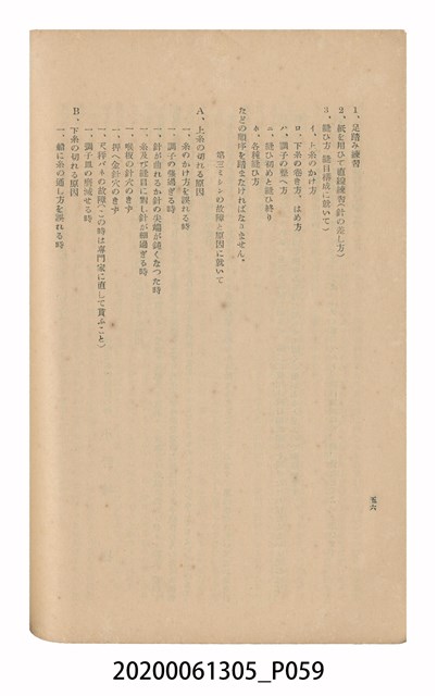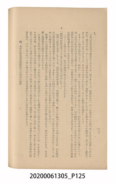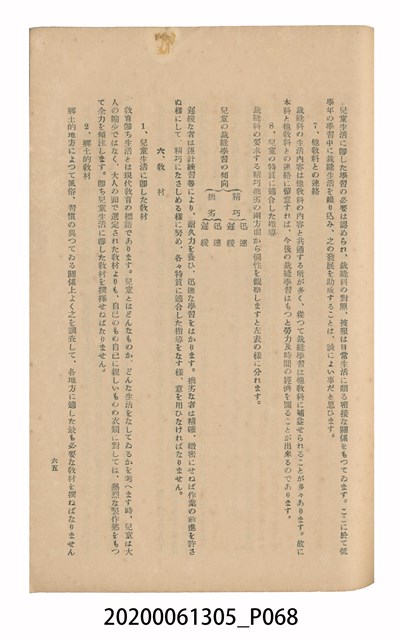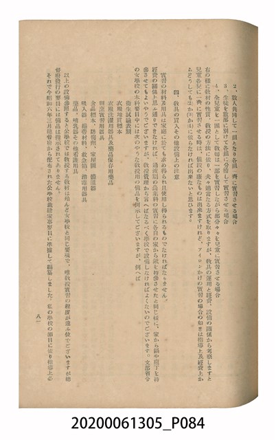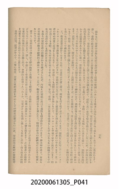 1.本物件是《裁縫家事教育研究會要項》,封面中央印書名,書名右上印「昭和七年二月二十六日二十七日」,左下處印「會場 新竹女子公學校(按:今新竹市民富國小)」、「主催(按:主辦)新竹州」兩行字。本書內容主要是該次研究會的相關資訊。2.臺灣學校的美術教育始於日治時期,在初等教育方面,於1912年11月28日修正的「臺灣公學校規則」,修業年限6年之公學校首度出現「手工及圖畫」教學科目;1921年,「手工及圖畫」科各自獨立為「手工科」和「圖畫科」,圖畫科的教學內容包括臨畫、寫生畫、考察畫等,並可依據各地方情況加課幾何畫。各地方政府不定期會針對圖畫教育舉辦研究會,討論教學相關方法。3.1904年3月11日修正公布的「臺灣公學校規則」,首度將裁縫科列為教學科目,至1912年11月28日修正的「臺灣公學校規則」,則改裁縫科為裁縫及家事科,並成為日治時期初等教育定制。裁縫及家事科只有女子才要修習,實施要旨包括知識技能的習得、助長興趣、婦德的養成等3項。各地方政府不定期會針對該科舉辦研究會,討論教學相關方法。