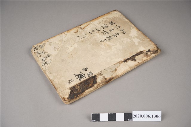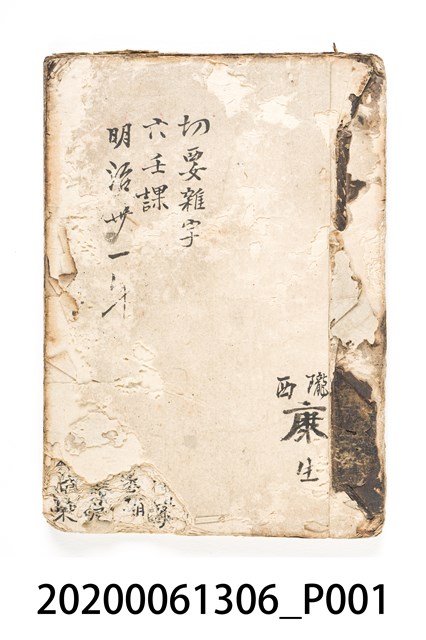 1.本件長11公分、寬16.6公分、高0.8公分,原件名稱為「西隴康生《切要雜字》」應修正為「隴西康生《切要雜字》」。本件應為日治初期,練習毛筆字所使用之雜記本,內容包含地點如奠音殿;或者是相關成語如盤古開天、乾坤始奠、煉石補天等內容。可以確定的是,在本件文物中以出現「天皇日月」的字樣,推測可能為漢人私塾的學生練習內容。