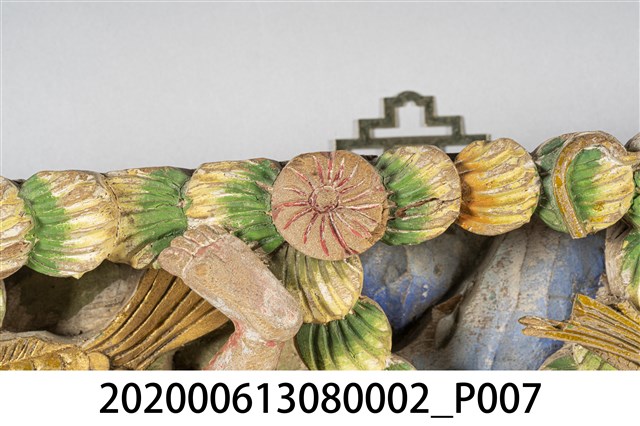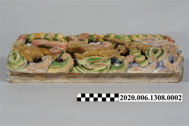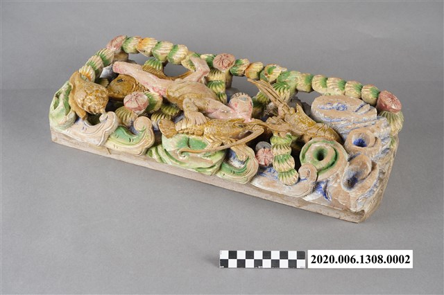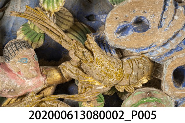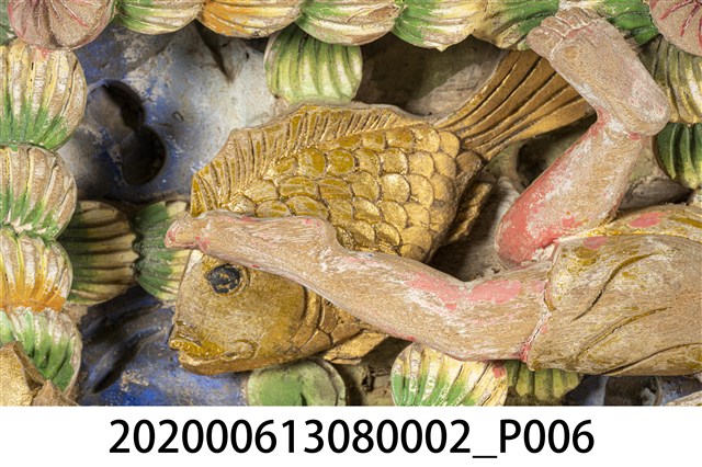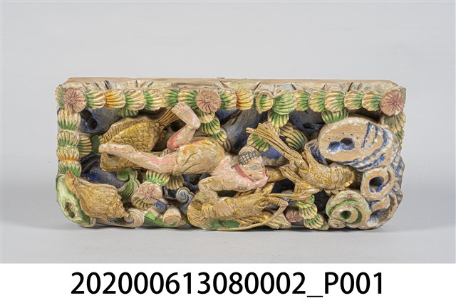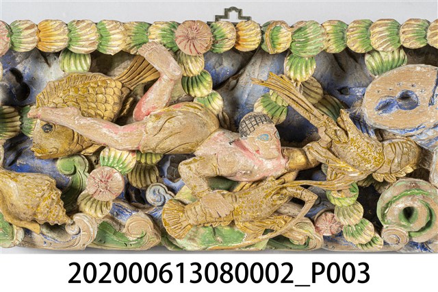 本件為兩個雕塑品,根據作品花色推測應為廟宇裝飾品。雕刻內容呈現捕魚蝦之情景,雕塑品的最外圍以貝殼裝飾,雕塑品有一潛水夫打赤膊工作,雕塑品的生物有龍蝦、魚、蝦及海螺,並以藍白兩色代表海洋。