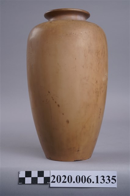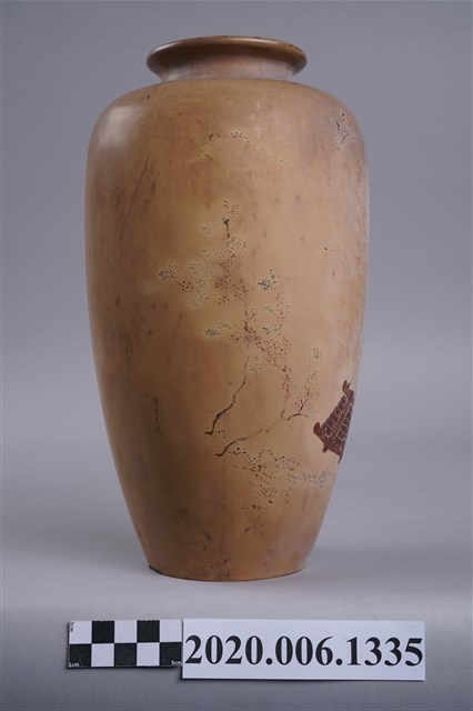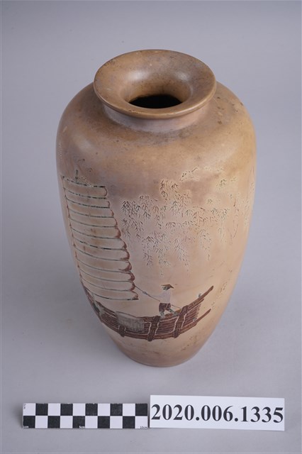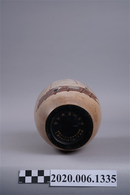 1. 本件為漆器竹筏圖案花瓶,尺寸高26.5公分、直徑14公分。瓶身繪有單桅舢舨船,有一船夫頭戴斗笠拉著船帆,舢舨船上,還有一個已放水之木桶,推測是用來安放補上岸的魚隻。花瓶瓶身有「臺灣竹筏」,花瓶底部有「后里圳復興紀念」、「昭和十年四月二十一日震災」、「昭和十一年一月二十五日竣工」等字樣。 2. 本件瓶底所述之事件為1935年4月21日發生於新竹州、臺中州交界的地震,震央位於兩州間的大安溪。本次地震也造成各機關、設施崩壞、人員死傷與財損,其中后里圳受地震影響而崩壞,致使依靠后里圳地區停水,經后里圳水利組合緊急籌錢修復後,屬於相對損失較少的地區,稻作仍可一年二收。