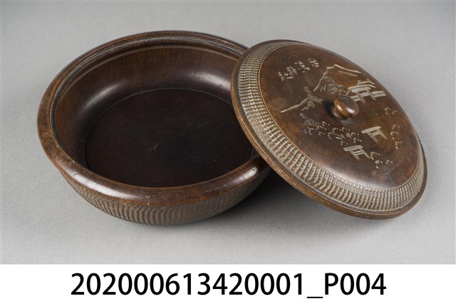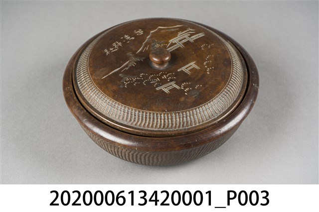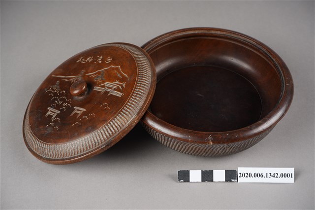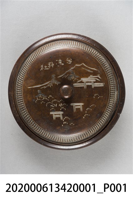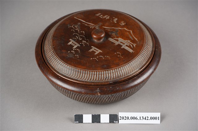 1. 本件為木製臺湾神社圖樣漆器糖果盒組,共計有3件,材質皆為木製品,其中有2件呈現深咖啡色,1件為土咖啡色。土咖啡色件的盒蓋刻有「台湾」字樣,並刻有三座鳥居,為呈現鳥居的不同高度,則呈現往右上角度愈高,還刻有樹林與一座山。另外兩件深咖啡色的盒蓋,則明確刻出「台湾神社」四字,同樣有三座鳥居、樹林與山,但鳥居的刻畫線條比土黃色件清晰。依臺灣神社座落地點,漆器上的山應為劍潭山。