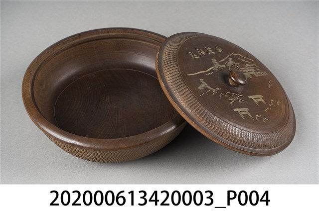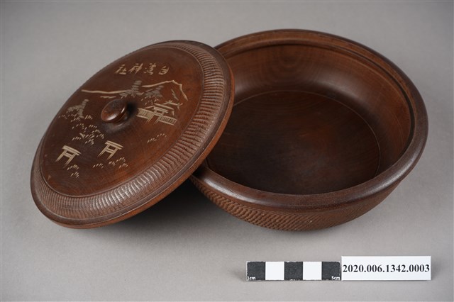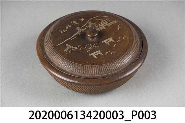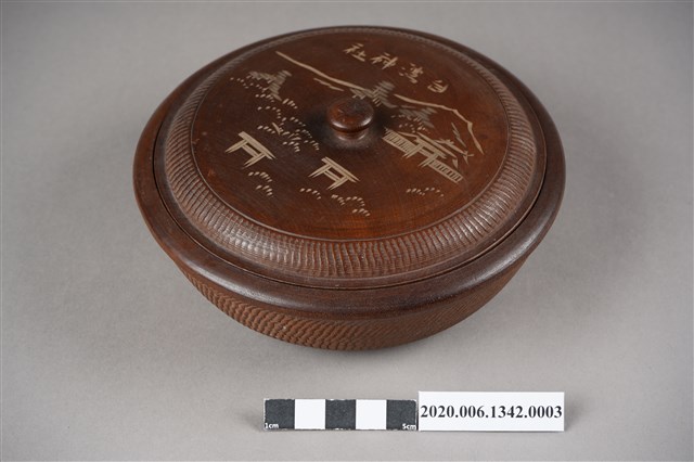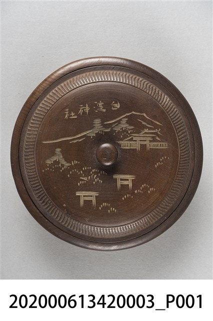 1. 本件為木製臺湾神社圖樣漆器糖果盒組,共計有3件,材質皆為木製品,其中有2件呈現深咖啡色,1件為土咖啡色。土咖啡色件的盒蓋刻有「台湾」字樣,並刻有三座鳥居,為呈現鳥居的不同高度,則呈現往右上角度愈高,還刻有樹林與一座山。另外兩件深咖啡色的盒蓋,則明確刻出「台湾神社」四字,同樣有三座鳥居、樹林與山,但鳥居的刻畫線條比土黃色件清晰。依臺灣神社座落地點,漆器上的山應為劍潭山。