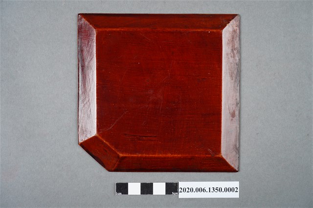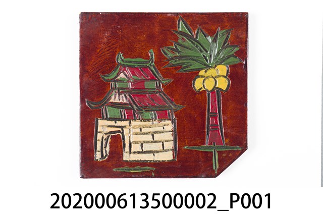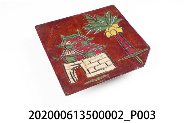 本件為木製原住民人文生活圖樣漆器擺飾組,為木製品,一組5件。尺寸長12.3公分、寬11.9公分、高0.5公分。左上角第一片為利用單桅舢舨船捕魚,有一人拉著船帆,右側刻有已結果的椰子樹。第二片呈現有兩人手持器具往柵欄內戳的動作。第三片是原住民女性穿著傳統服飾、手持杵棒(舂米使用的器具),圍成一圈,利用杵棒杵棒敲擊地板,發出杵音後,搭配歌聲形成「杵歌」。下方左邊第一片為兩名身穿原住民傳統服飾的人正在香蕉樹旁搗米。最後一片則是城牆與椰子樹。