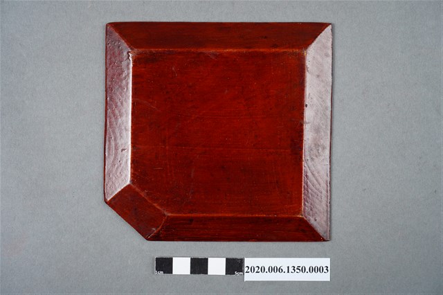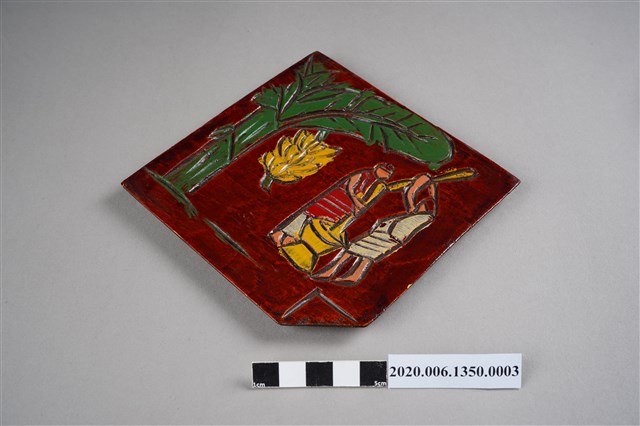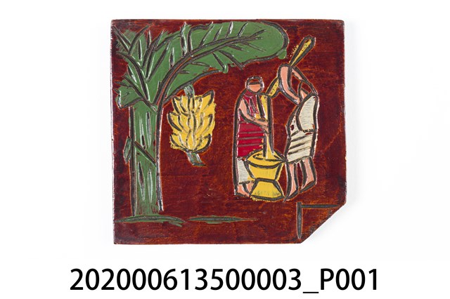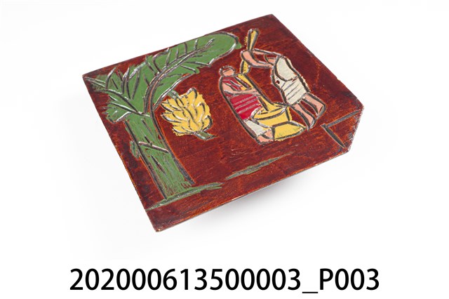 本件為木製原住民人文生活圖樣漆器擺飾組,為木製品,一組5件。尺寸長12.3公分、寬11.9公分、高0.5公分。左上角第一片為利用單桅舢舨船捕魚,有一人拉著船帆,右側刻有已結果的椰子樹。第二片呈現有兩人手持器具往柵欄內戳的動作。第三片是原住民女性穿著傳統服飾、手持杵棒(舂米使用的器具),圍成一圈,利用杵棒杵棒敲擊地板,發出杵音後,搭配歌聲形成「杵歌」。下方左邊第一片為兩名身穿原住民傳統服飾的人正在香蕉樹旁搗米。最後一片則是城牆與椰子樹。