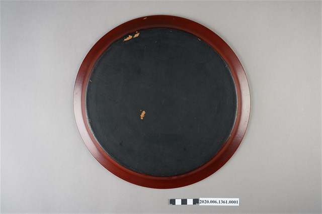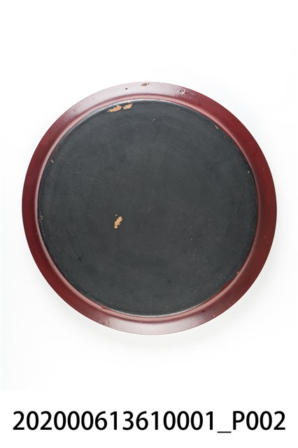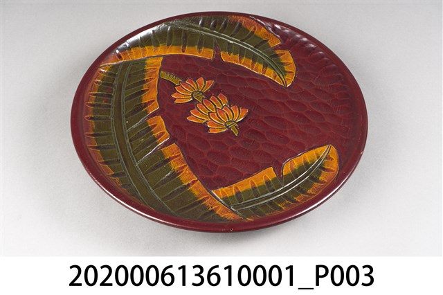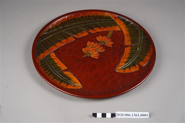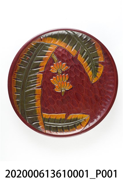 本件為香蕉樹漆器圓盤組,本件尺寸高1.4公分、直徑29公分。該組文物共計一組8件。圓盤以深紅色為底色,並有水波紋路,每一件皆繪有即將成熟的香蕉與香蕉樹(葉)。