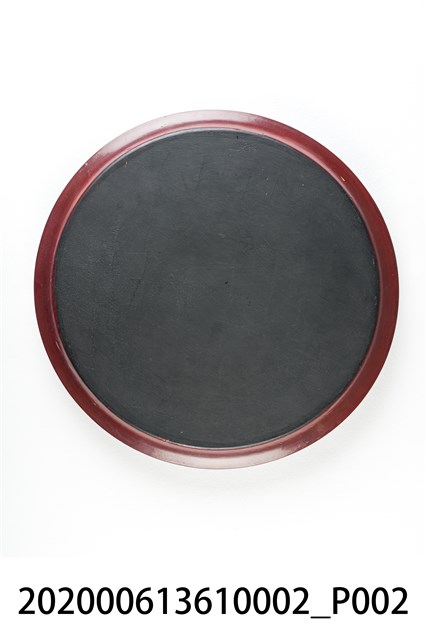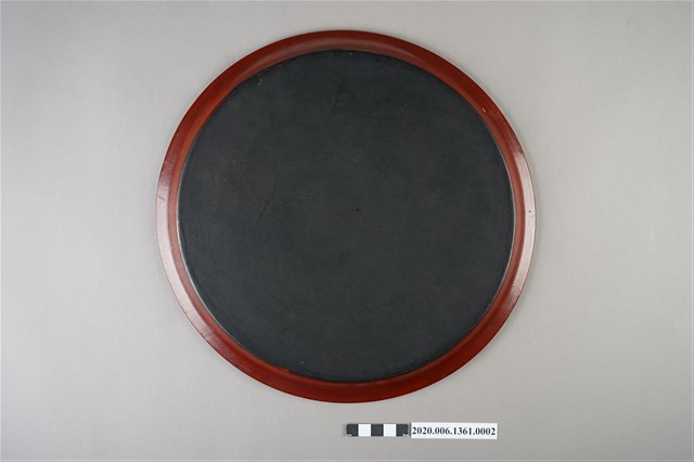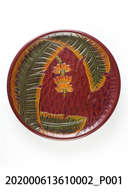 本件為香蕉樹漆器圓盤組,本件尺寸高1.4公分、直徑29公分。該組文物共計一組8件。圓盤以深紅色為底色,並有水波紋路,每一件皆繪有即將成熟的香蕉與香蕉樹(葉)。